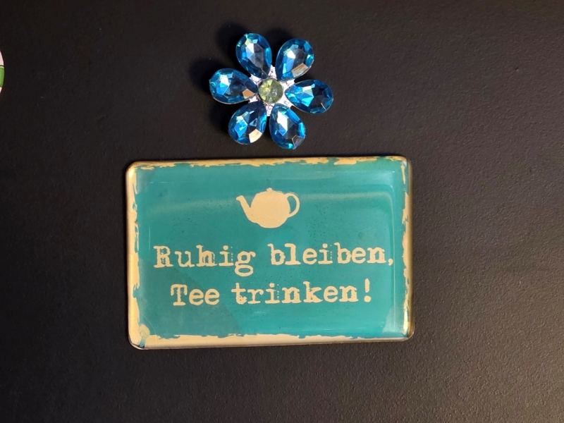 Die untere Wand an unserem Küchenfenster, direkt neben der Spüle, ist magnetisch und außerdem mit Kreide beschreibbar. Dort sammelt sich allerlei Gedöns: Postkarten, kleine Zettel mit Zahnarztterminen, Einkaufslisten und eben auch diese beiden Magnete.