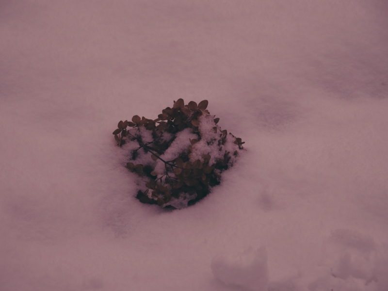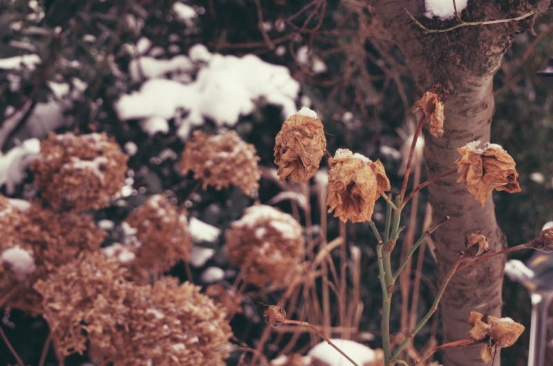 Wir schneiden unsere verblühten Pflanzen und Blumen immer erst im Frühjahr zurück. Die Blüten an der Rose und den Hortensien sind inzwischen vollständig vertrocknet und wirken ein wenig traurig.