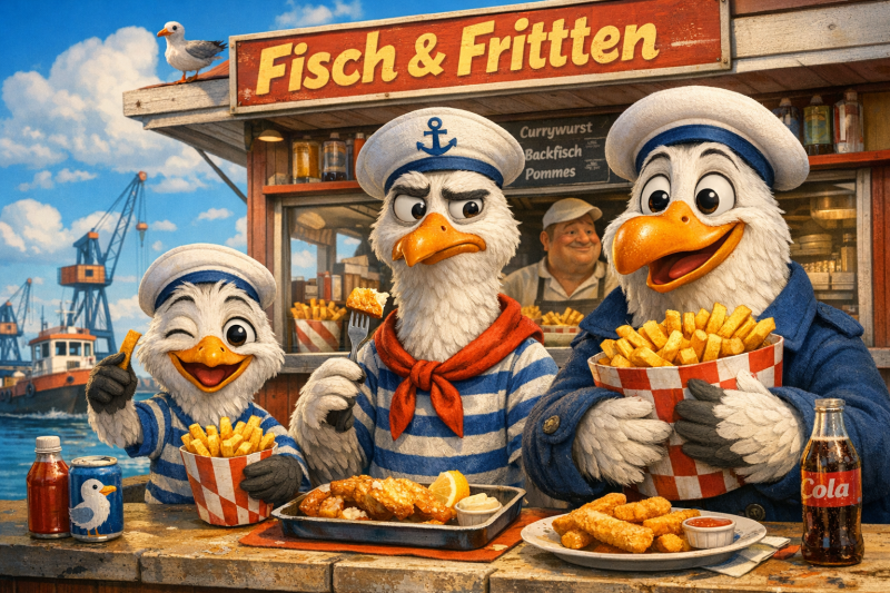 Claus lacht, die Fritteuse zischt, und über dem Hafen liegt der Duft von Pommes, Fischbrötchen und Möwenklatsch. Im Hintergrund tuckert ein Kutter vorbei, und eine Möwe auf dem Dach kräht: „Mittagspause bei Claus – dat is wie Urlaub in St. Tropez, nur mit mehr Wind und weniger Schickimicki!