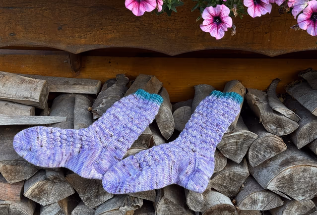 Wenn es ein Sockenmuster gibt, das sich abends – nachdem mein Gehirn vom Arbeitstag auf Standby geschaltet ist – herrlich entspannt stricken lässt, dann ist es das Minecraft-Muster. Da muss ich nicht mehr viel denken, nur rechte und linke Maschen zählen. Dieses Mal in zartem Flieder – wie immer im Schlauchanschlag.